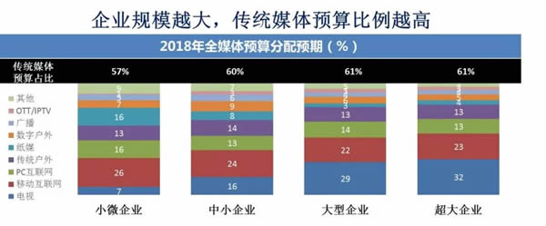 為什么?首先說說電視。企業(yè)規(guī)模越大,選擇電視媒體和傳統(tǒng)媒體的預(yù)算比例就越高。這并不是偶然的,因為所有的大型企業(yè)它們都是建立在工業(yè)生產(chǎn)的規(guī)?;a(chǎn)的效率上,只有大的規(guī)模,才可以獲得更高的利潤才可以形成發(fā)展空間。所以當(dāng)需要大規(guī)模生產(chǎn)基礎(chǔ)上的營銷活動,勢必要大規(guī)模的消費者觸達,而這種規(guī)模性的營銷——定時的爆發(fā)點的、有傳播勢能的營銷,其實是在以電視為首的這樣傳統(tǒng)媒體上予以形成的。所以我們會看企業(yè)規(guī)模越大,在傳統(tǒng)媒體上的預(yù)算是越高的。