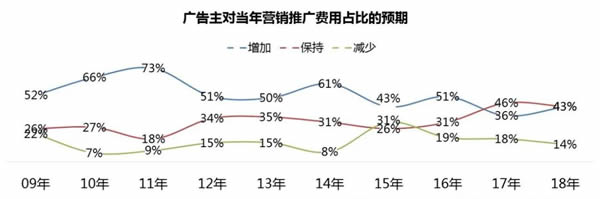 根據(jù)調(diào)查數(shù)據(jù)顯示,在過去這些年起起伏伏的趨勢中,去年和往年不太一樣,保持投入的廣告主的比例最高,達到46%,今年增加和持平的廣告主比例達到相對持平的狀態(tài)為43%,也就是希望增加投入以及希望減少投入的廣告主的比例基本上是一致的。