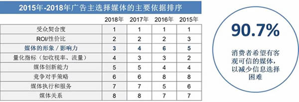 首先就是媒體的品牌化,也可以說是媒體可信度的兌現(xiàn),無論什么方式,其實它是可以去兌現(xiàn)的維度。從廣告主調(diào)研的結(jié)果看,媒體的形象/影響力在15年的時候排在第5位5,后來下降成6,去年回到4,那么今年更是回到了3意味著什么?當(dāng)我們的信息或者非常碎片化的時候,以及所有的信息過載的這個狀態(tài)下的時候,能不能給我靠譜的信息變成了重要的事情,90%以上的消費者希望有可信的媒體減少信息選擇困難。